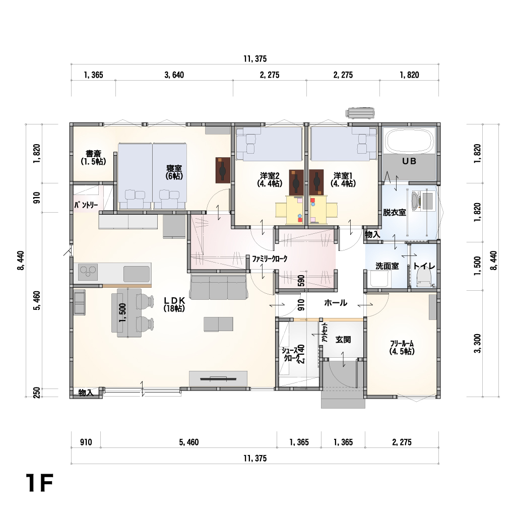 平屋最大の4LDK。書斎とフリースペースを備え、部屋数も広さも妥協しない贅沢な間取り。